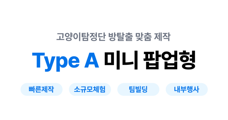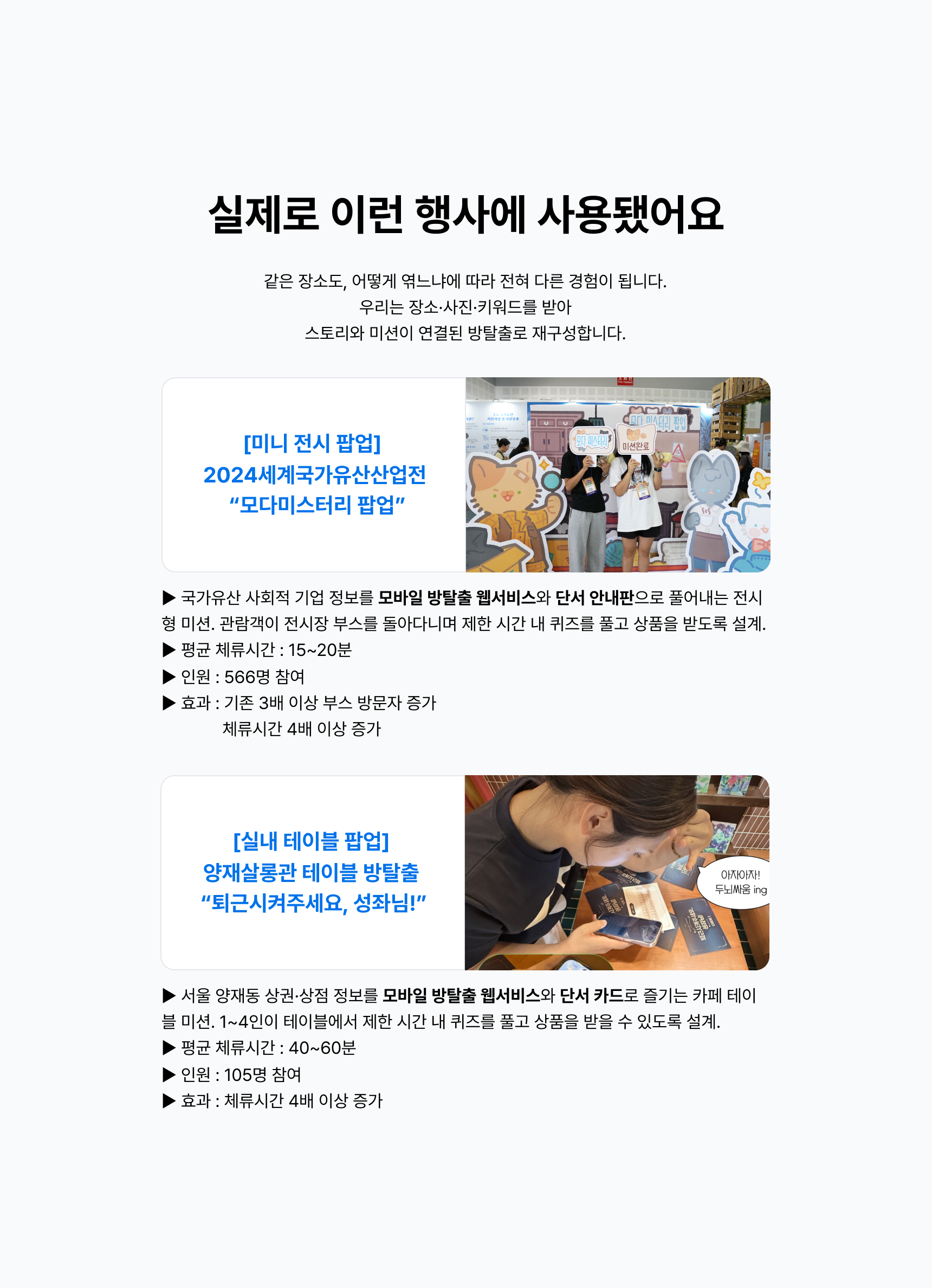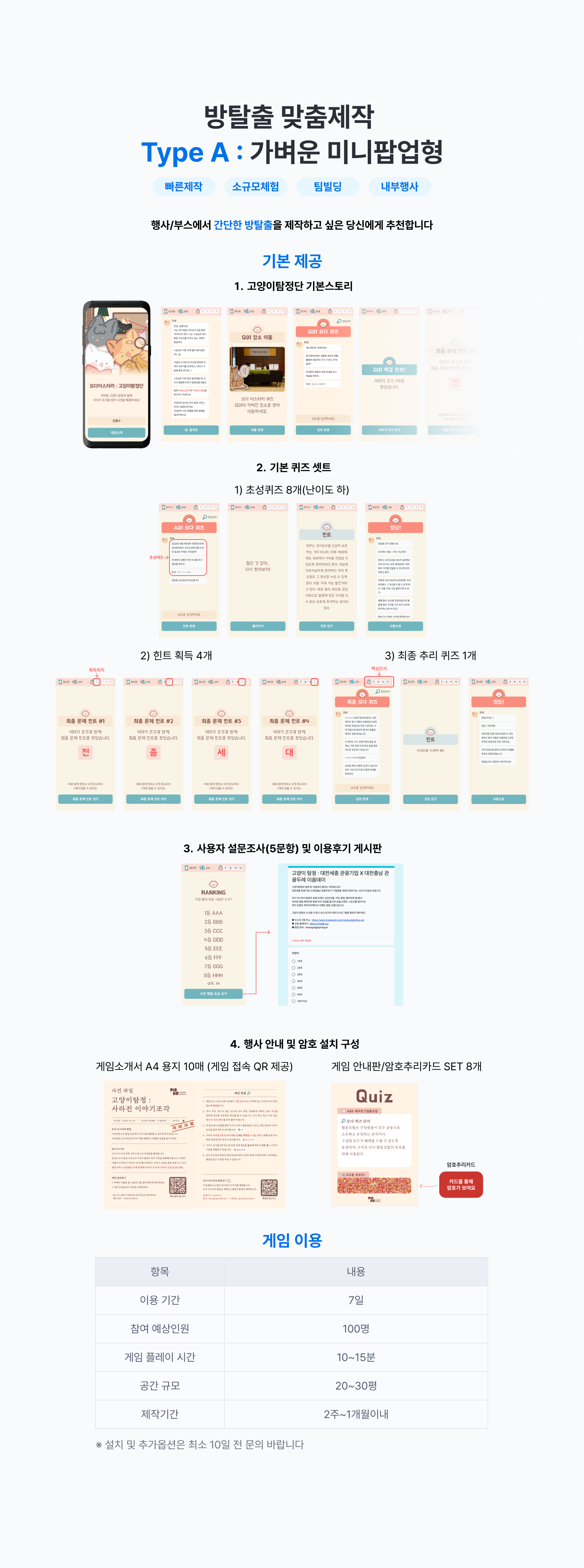 - 최소한의 구성으로 행사/부스 내에서 간단한 방탈출형 체험 제공- 초성퀴즈 기반 / 실내 소형 공간- 1일 운영, 2명 운영인력, 소규모 체험에 적합
