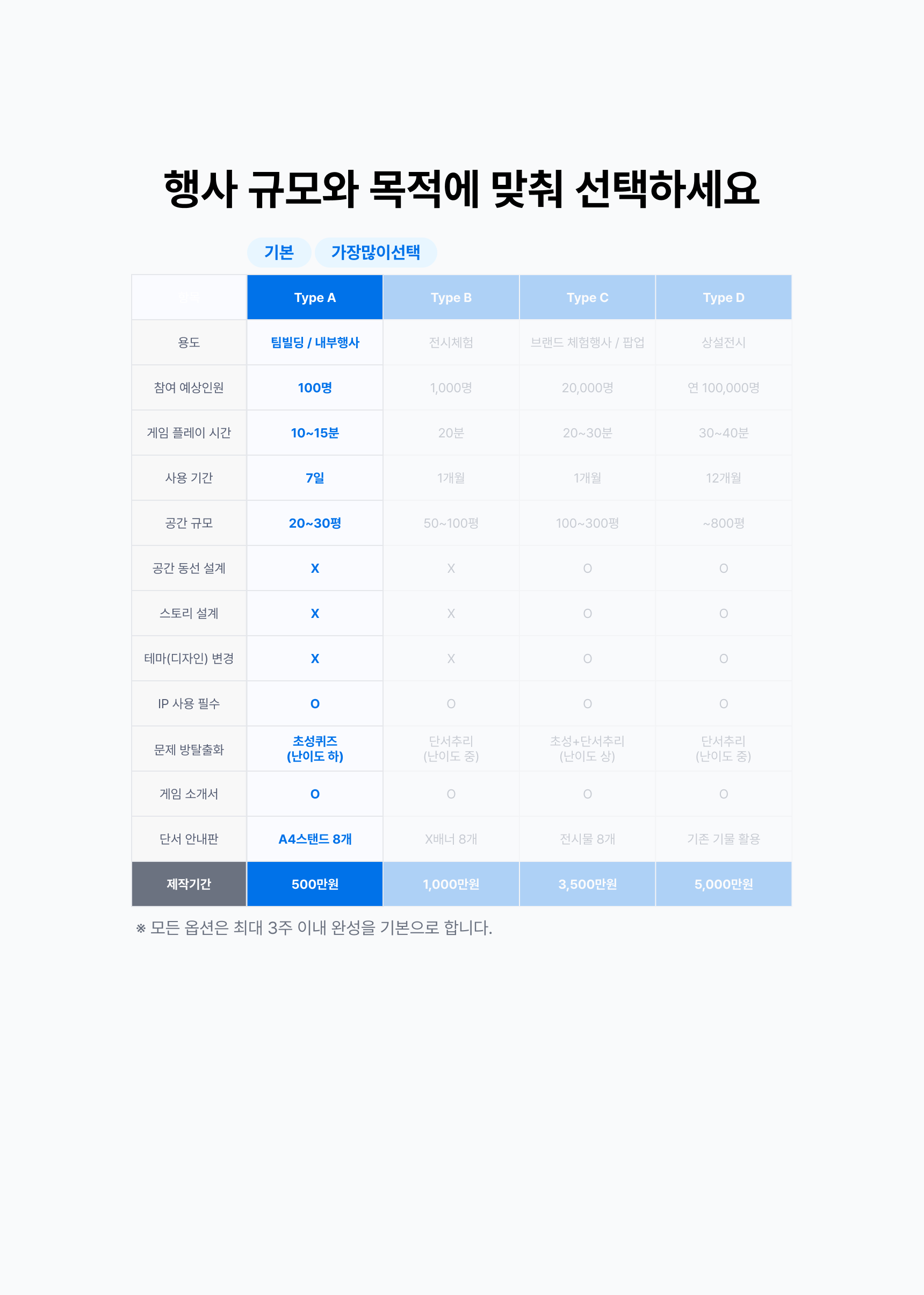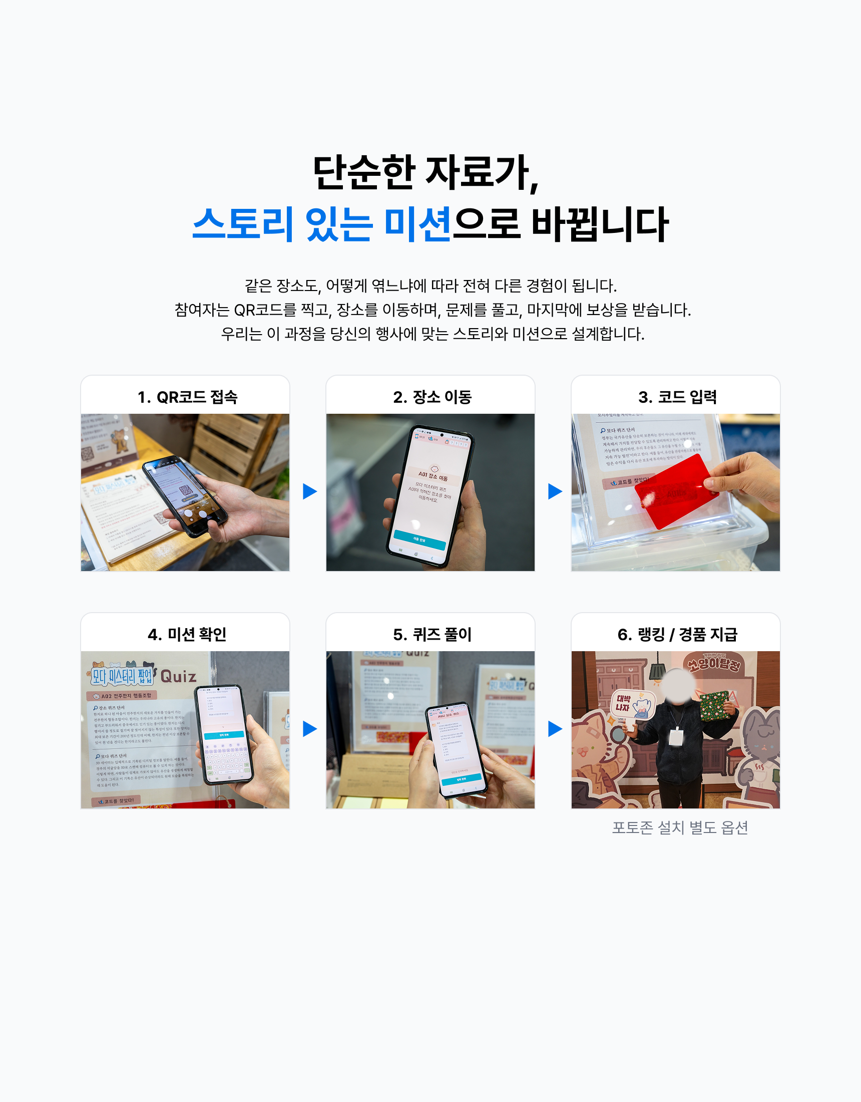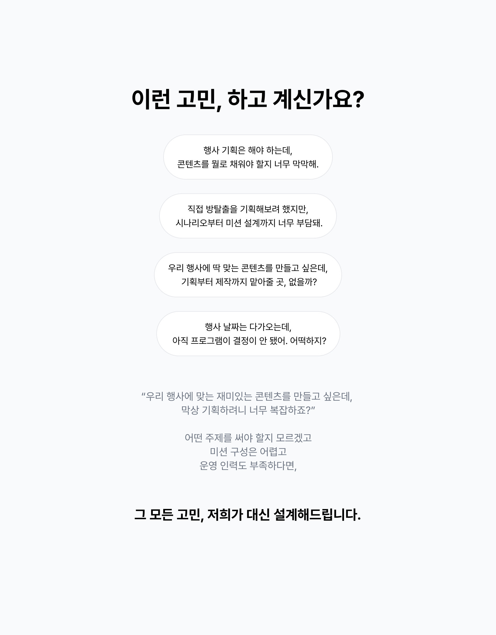 - 최소한의 구성으로 행사/부스 내에서 간단한 방탈출형 체험 제공- 초성퀴즈 기반 / 실내 소형 공간- 1일 운영, 2명 운영인력, 소규모 체험에 적합